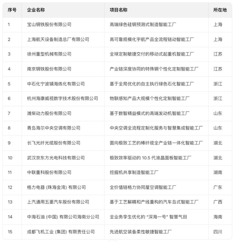 2025年首批15家领航级智能工厂名单