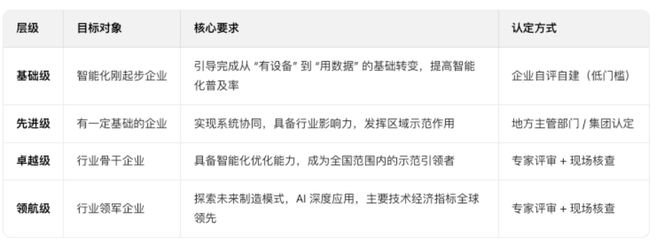 工信部早就给出了智能工厂的四级梯度培育体系:基础级、先进级、卓越级、领航级。这正是给传统工业企业的“升级路线图”。